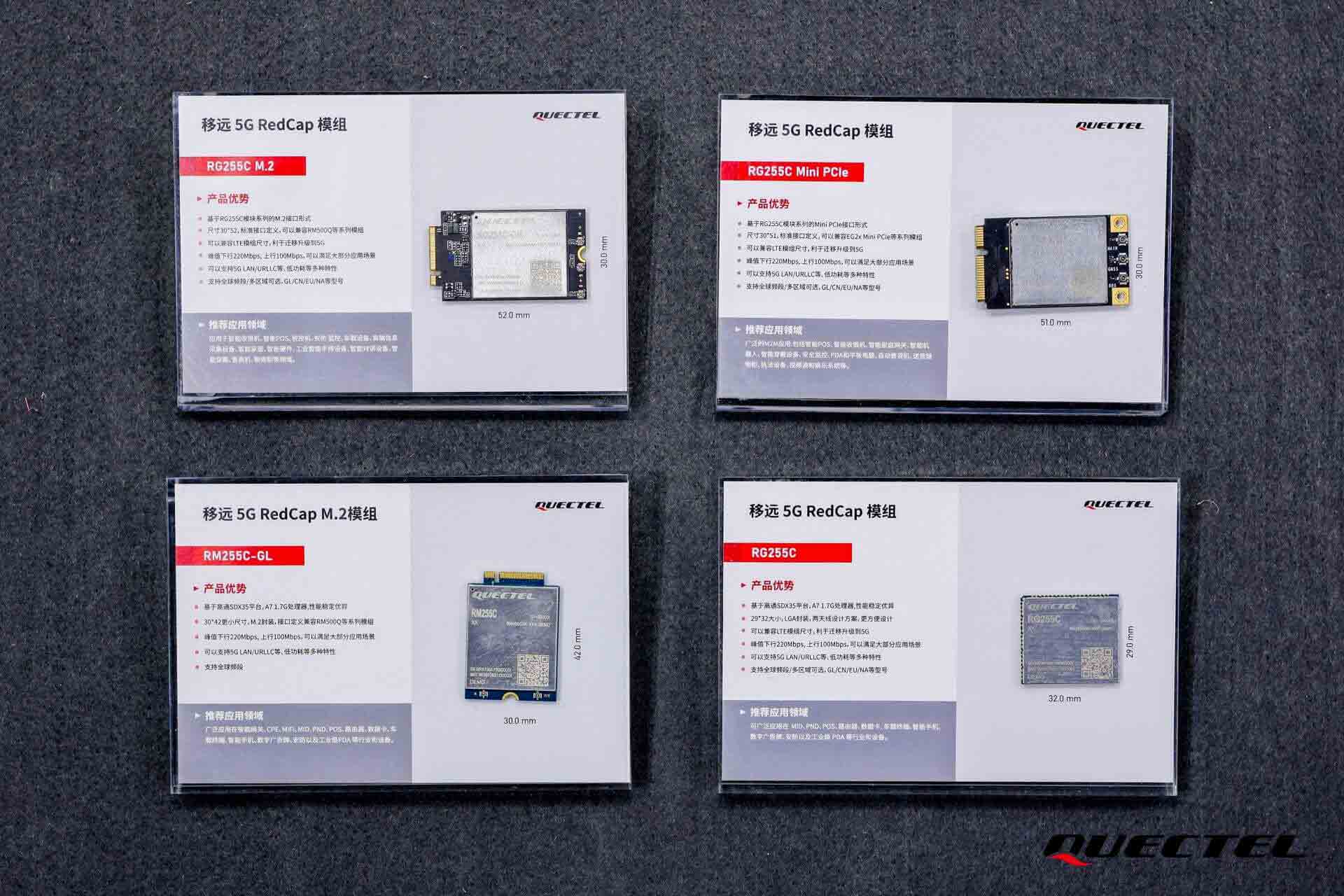 此次展会,移远通信带来了其多款不同封装的RedCap模组,包括RG255C、RG255C M.2、RG255C Mini PCIe、RM255C-GL等,多样化的型号和封装方式便于客户根据自身需求,进行灵活选择。