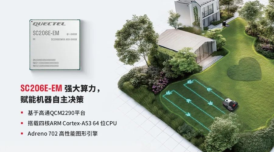 移远通信SC206E-EM智能模组宛如割草机的“智慧大脑”,为其各项先进功能提供底层技术支撑。该模组基于高通QCM2290平台开发,搭载四核ARM Cortex-A53 64 位处理器,主频高达2.0 GHz,搭配Adreno 702 高性能图形引擎,可流畅处理1080P@30fps视频数据,为割草机器人提供出色的图像处理能力。强劲计算性能确保SLAM算法等复杂计算的实时运行,为割草机自主决策提供充沛算力。