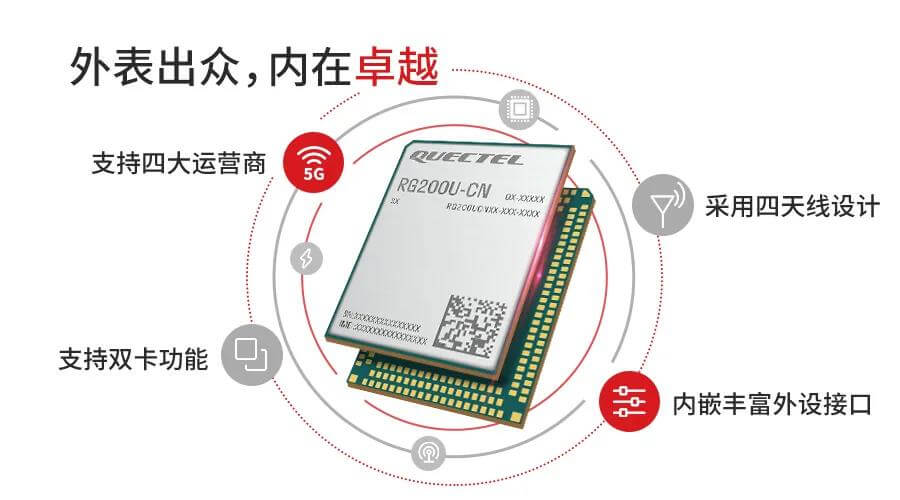RG200U支持5G NR Sub-6GHz频段及5G独立组网(SA)和非独立组网(NSA)双模网络,并向下兼容4G/3G。其还支持国内四大运营商5G/4G高速接入、TDD和FDD两种模式及双卡功能。